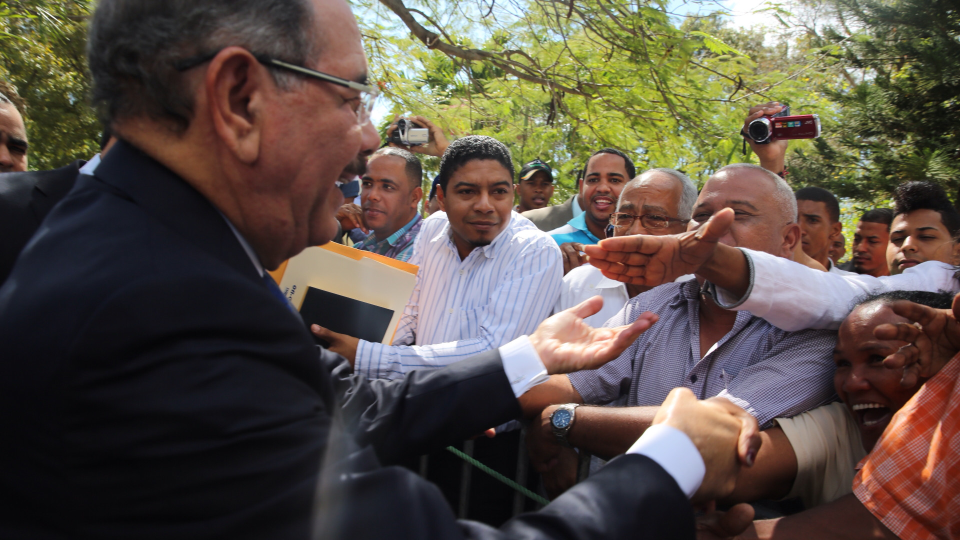 El presidente Danilo Medina extiende las manos para corresponder el saludo de moradores de la zona que salieron a su encuentro durante los actos de celebración del 250 aniversario de fundación de Baní