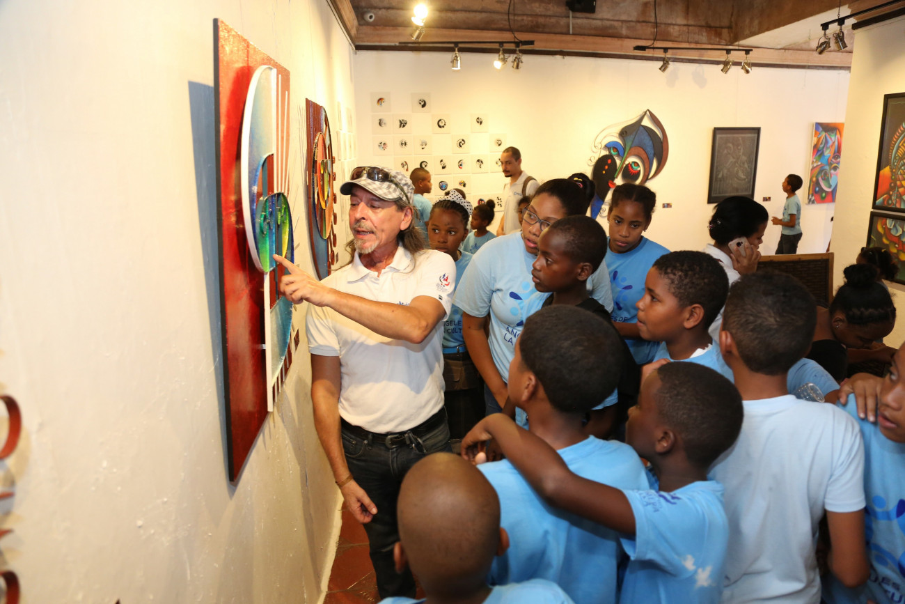 Niños y adolescentes del programa Ángeles de la Cultura durante su visita a la exposición de pintura “Fazcara”, del pintor chileno Geraldo Patricio González (Pato), en Casa de Teatro.