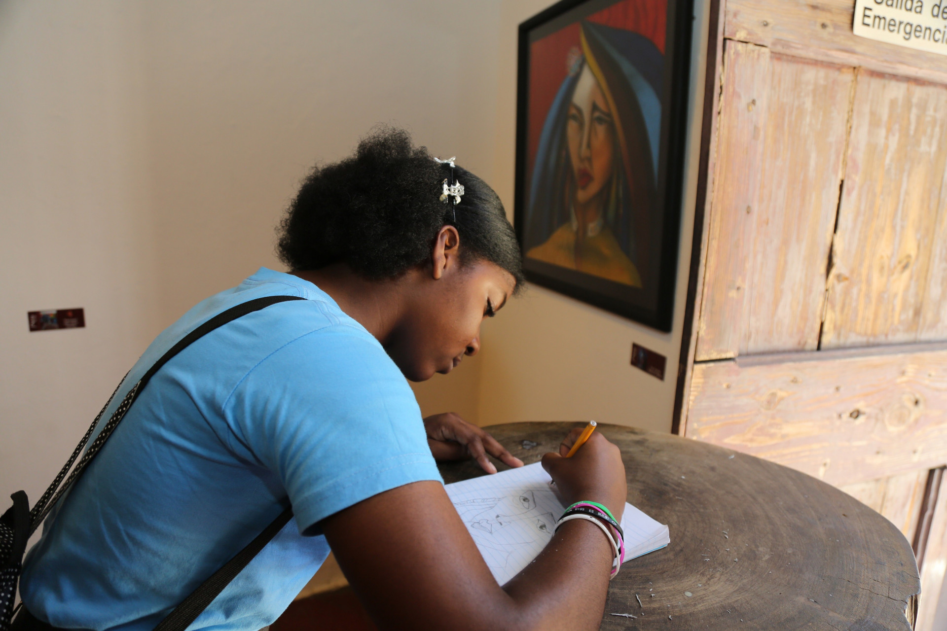 Niños y adolescentes del programa Ángeles de la Cultura visitan exposición de pintura “Fazcara” de Patricio González, en Casa de Teatro