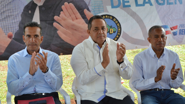 El viceministro de Producción y Desarrollo Comunitario del Ministerio Administrativo de la Presidencia, Juan Pumarol, y el director general del IAD, Emilio Toribio Olivo, durante reunión de hoy con productores de la Asociación de Parceleros ASOPARCO, en Payabo, Monte Plata.