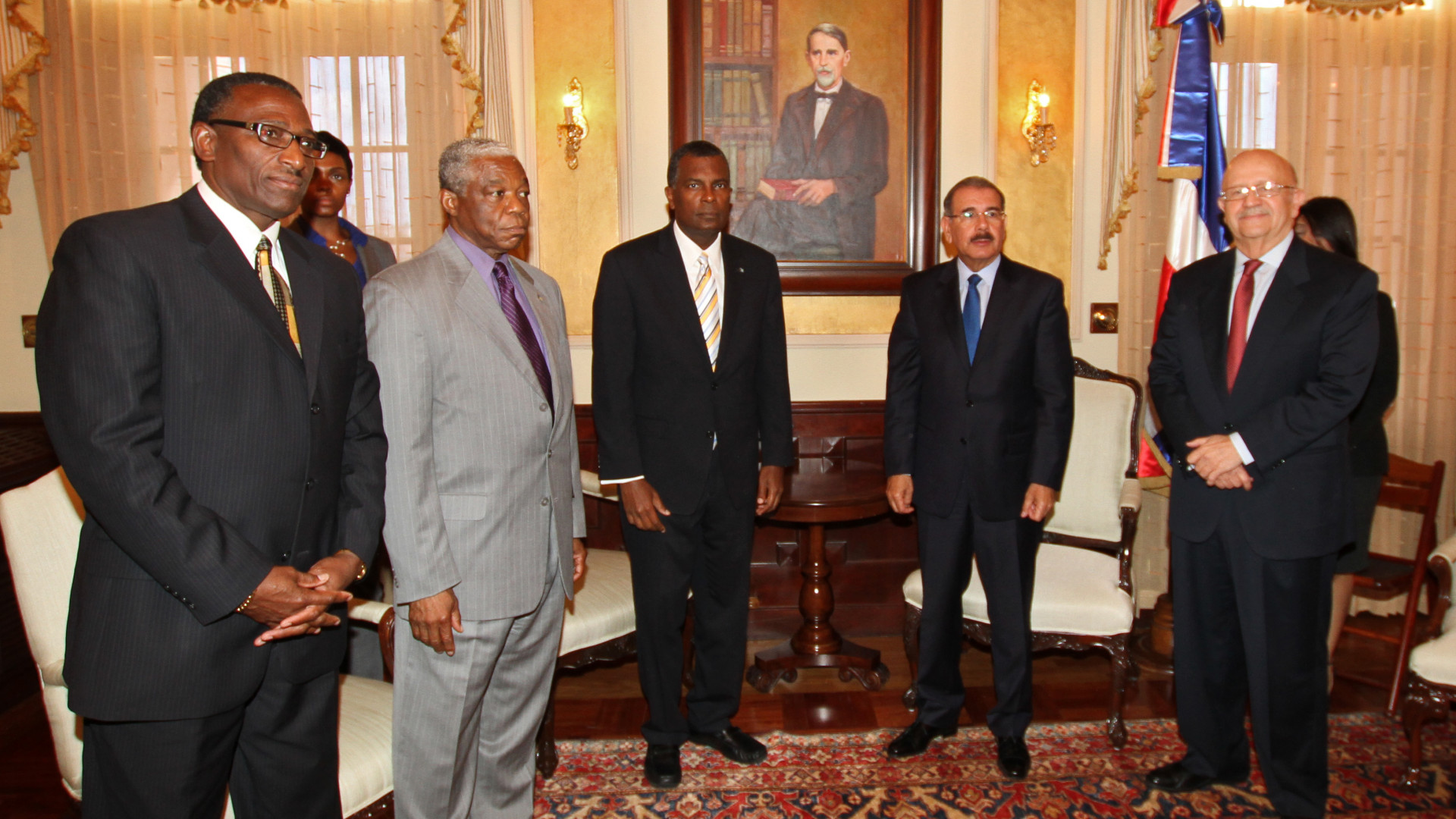 El presidente Danilo Medina al momento de recibir en audiencia privada en su Despacho del Palacio Presidencial al Canciller de las islas Bahamas, Frederick Audley Mitchell, junto a su comitiva, quienes se encuentran en el país en visita oficial.