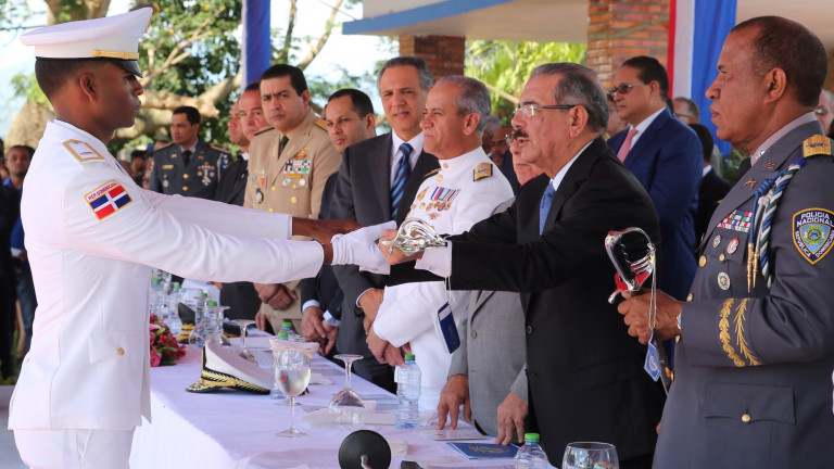 El presidente de la República, Danilo Medina y uno de los nuevos oficiales graduados, durante el ceremonial de entrega del sable de mando, símbolo de la autoridad que ejercerán con honor sobre las tropas de la República bajo su responsabilidad. Foto: Luis Ruiz Tito/Presidencia República Dominicana Nota de prensa: presidencia.gob.do/noticias/graduan-cadetes-de-la-policia...