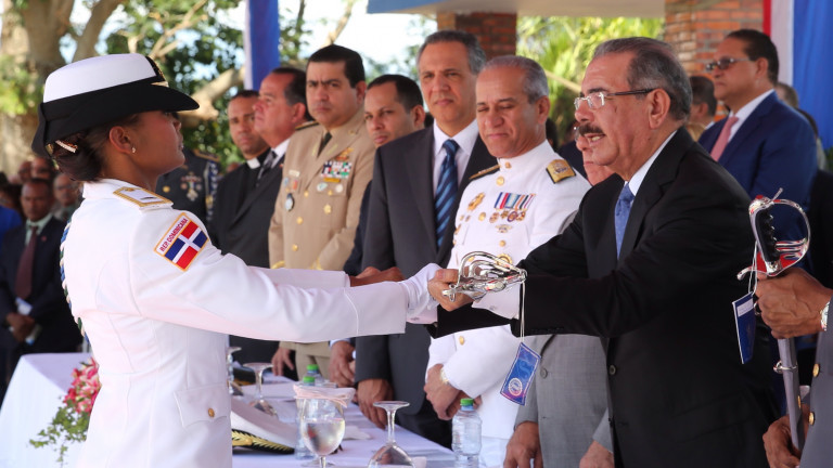 El presidente de la República, Danilo Medina y una de las nuevas oficiales graduadas, durante el ceremonial de entrega del sable de mando, símbolo de la autoridad que ejercerán con honor sobre las tropas de la República bajo su responsabilidad.