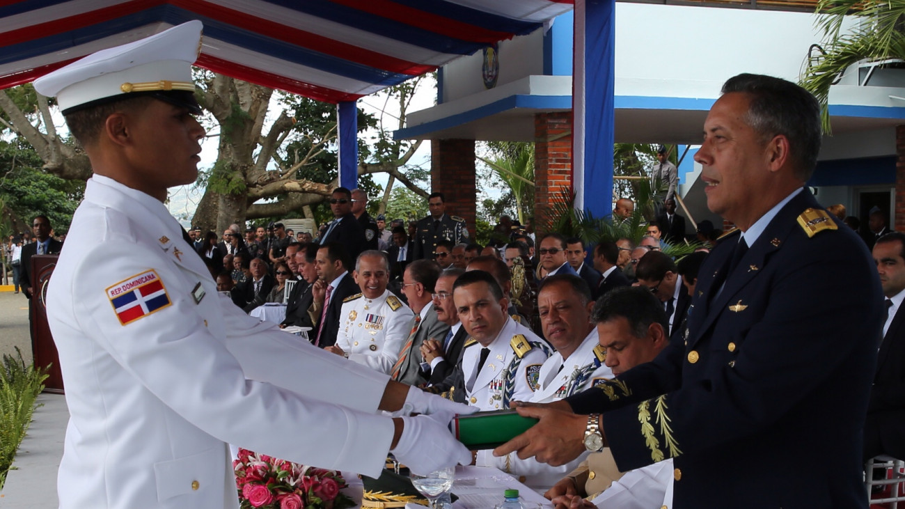 Acto de investidura de la Trigésimo Sexta Graduación Ordinaria de 35 cadetes de la Academia 2 de Marzo de la Policía Nacional, encabezada por el presidente Danilo Medina y principales autoridades de las Fuerzas Armadas y la Policía Nacional. Foto: Luis Ruiz Tito/Presidencia República Dominicana Nota de prensa: presidencia.gob.do/noticias/graduan-cadetes-de-la-policia...