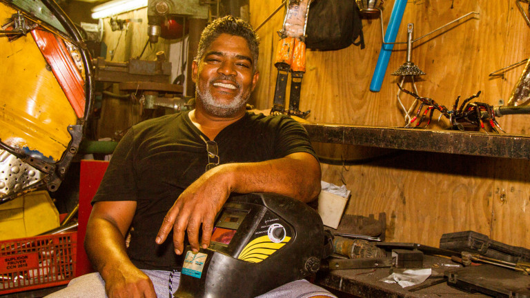 Recicla metales como insumos de sus esculturas. Lo que para unos es basura, para él es vida; en ellas “ve cosas raras” que ensambla a fuego limpio. Para Hamlet Báez, el barrio es manantial. Allí habitan las musas que viste de belleza en sus creaciones. #SomosDeBarrio