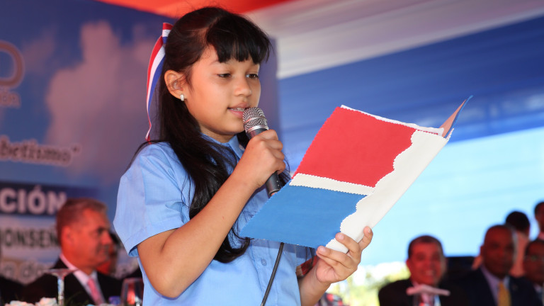 La alumna Ashley Jiménez, de 5to grado de la Escuela Ernesto Roque dio las gracias al presidente Danilo Medina por la entrega de su nueva escuela.