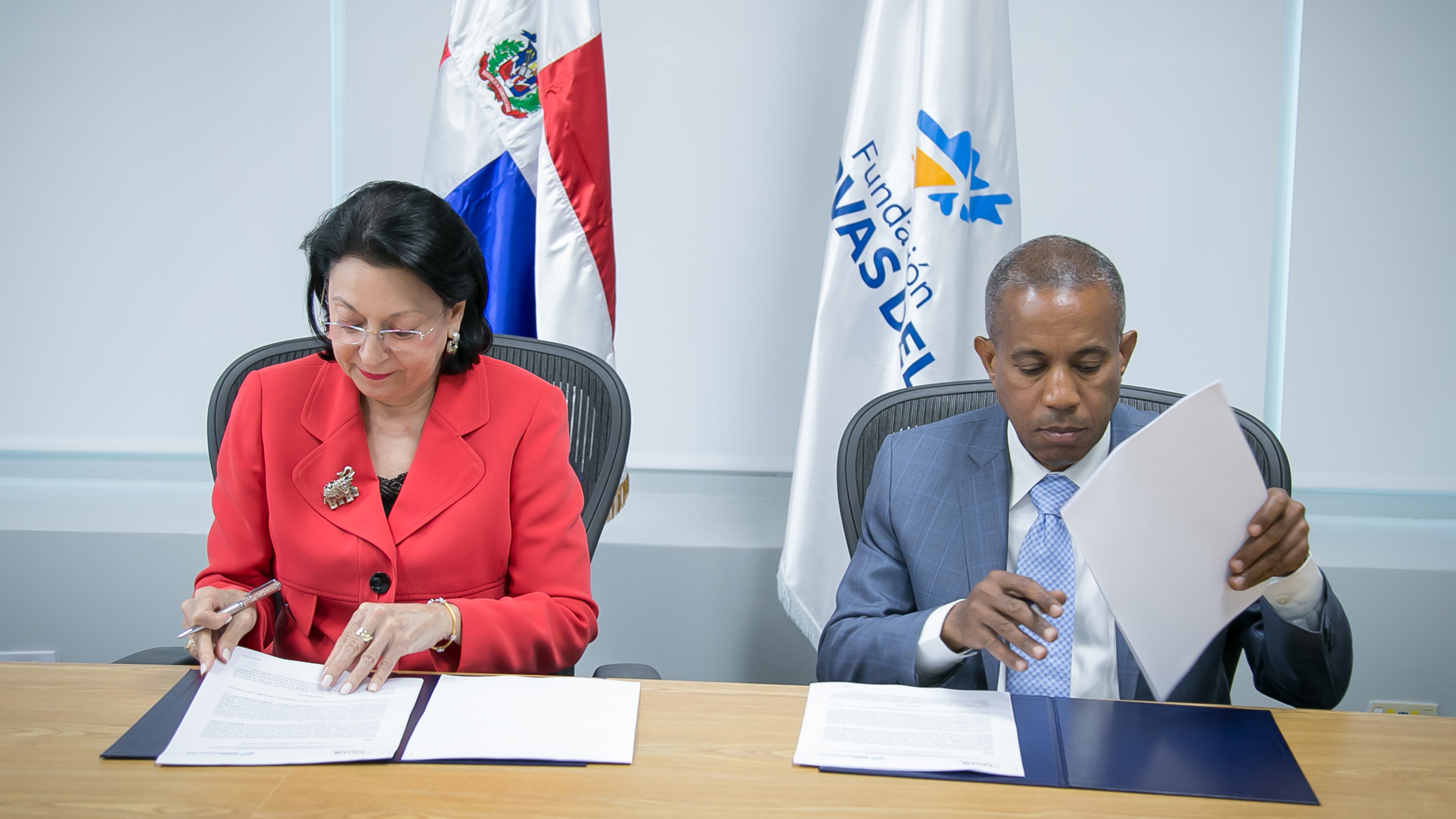 Rosa Rita Álvarez, presidenta ejecutiva de la Fundación Reservas del País, y Juan Francisco Caraballo, director del FEDA, durante la firma del convenio de colaboración.