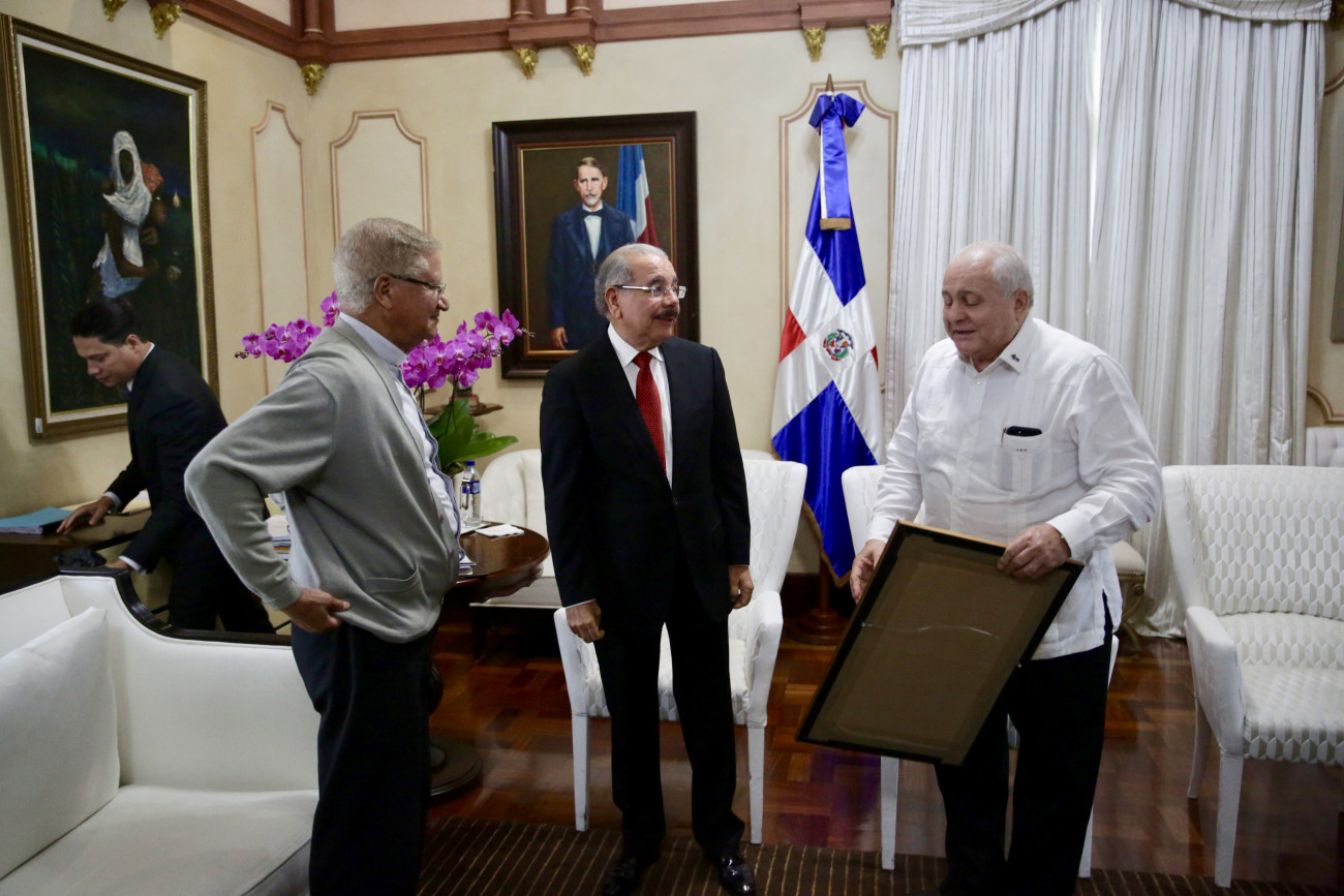 El presidente Danilo Medina junto al obispo de la Diócesis de San Francisco de Macorís, monseñor Fausto Ramón Mejía Vallejo; y el vicerrector de la Universidad Católica Nordestana (UCNE) y jefe del Cuerpo de Bomberos de ese municipio cabecera, general Luis Esmurdoc, durante su visita al Palacio Nacional. Foto: Romelio Montero/Presidencia República Dominicana Enlace noticia: presidencia.gob.do/noticias/presidente-danilo-medina-reci...