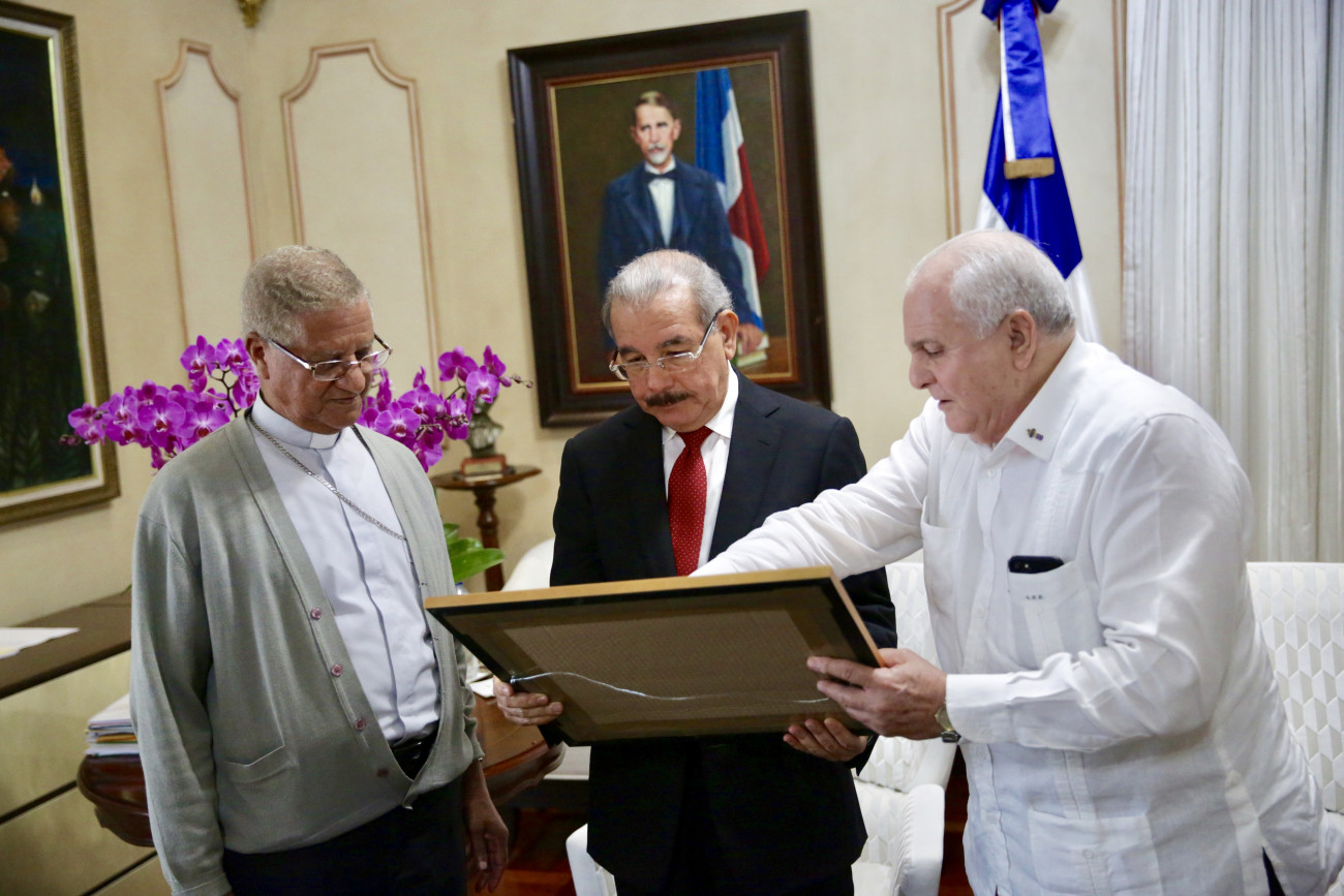 El presidente Danilo Medina junto al obispo de la Diócesis de San Francisco de Macorís, monseñor Fausto Ramón Mejía Vallejo; y el vicerrector de la Universidad Católica Nordestana (UCNE) y jefe del Cuerpo de Bomberos de ese municipio cabecera, general Luis Esmurdoc, durante su visita al Palacio Nacional.