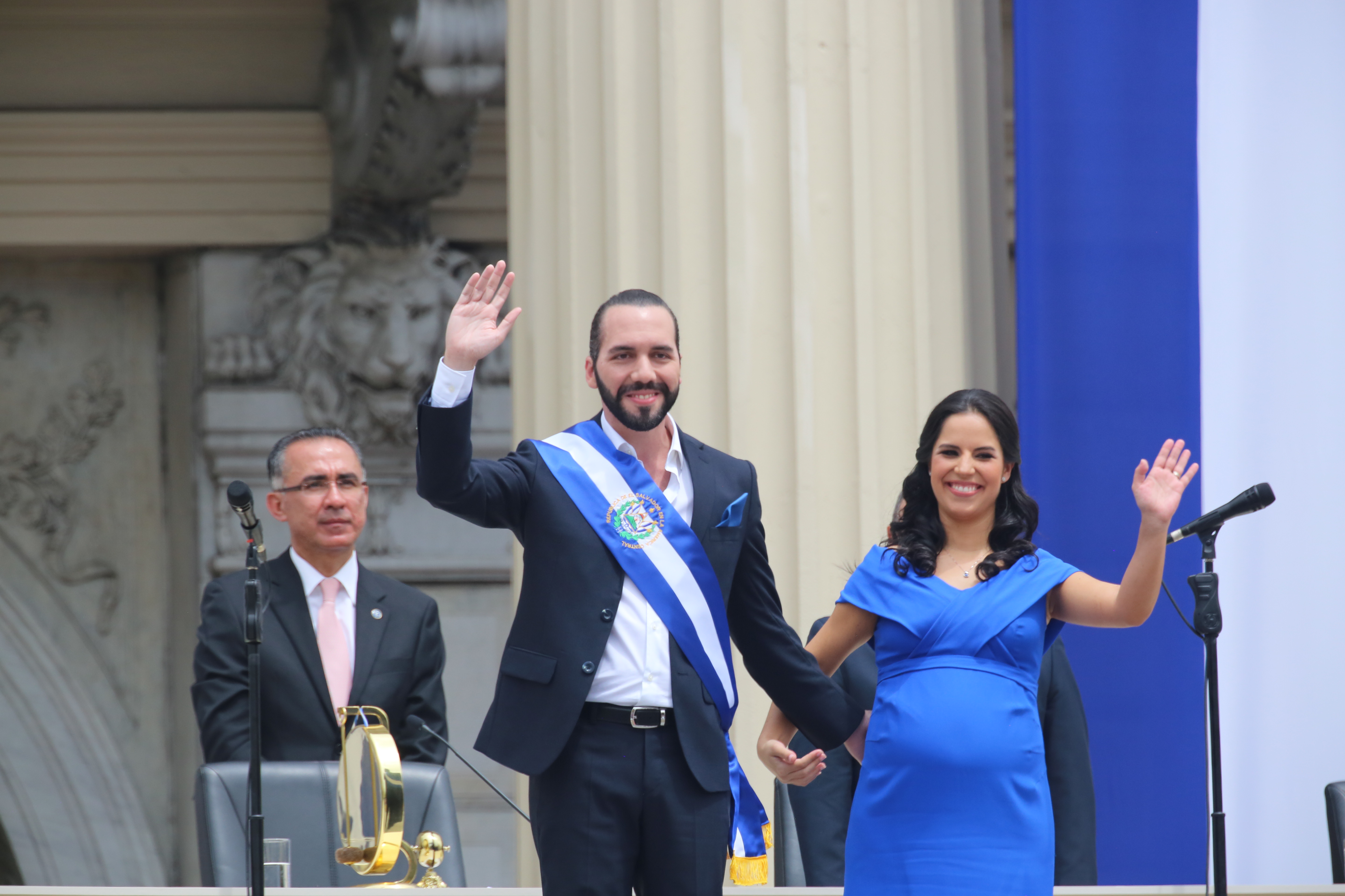 Nayib Bukele, nuevo presidente de El Salvador junto su esposa, la primera dama Gabriela Rodríguez de Bukele, saludan los presentes durante la ceremonia de toma de posesión para el período 2019-2024.