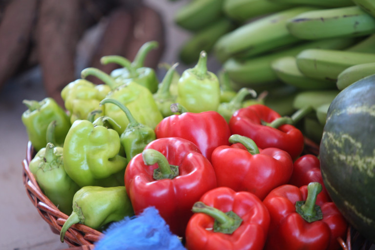 Productos agrícolas cultivados en la zona expuestos durante el acto de inauguración encabezado por el presidente Danilo Medina, en el Bajo Yaque del Norte, Montecristi.