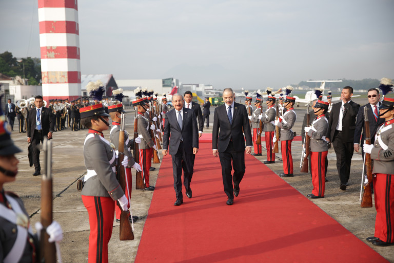 El presidente de la República Dominicana, Danilo Medina, durante su llegada a Guatemala, donde fue recibido por Luis Fernando Carranza, viceministro de Relaciones Exteriores de Guatemala.