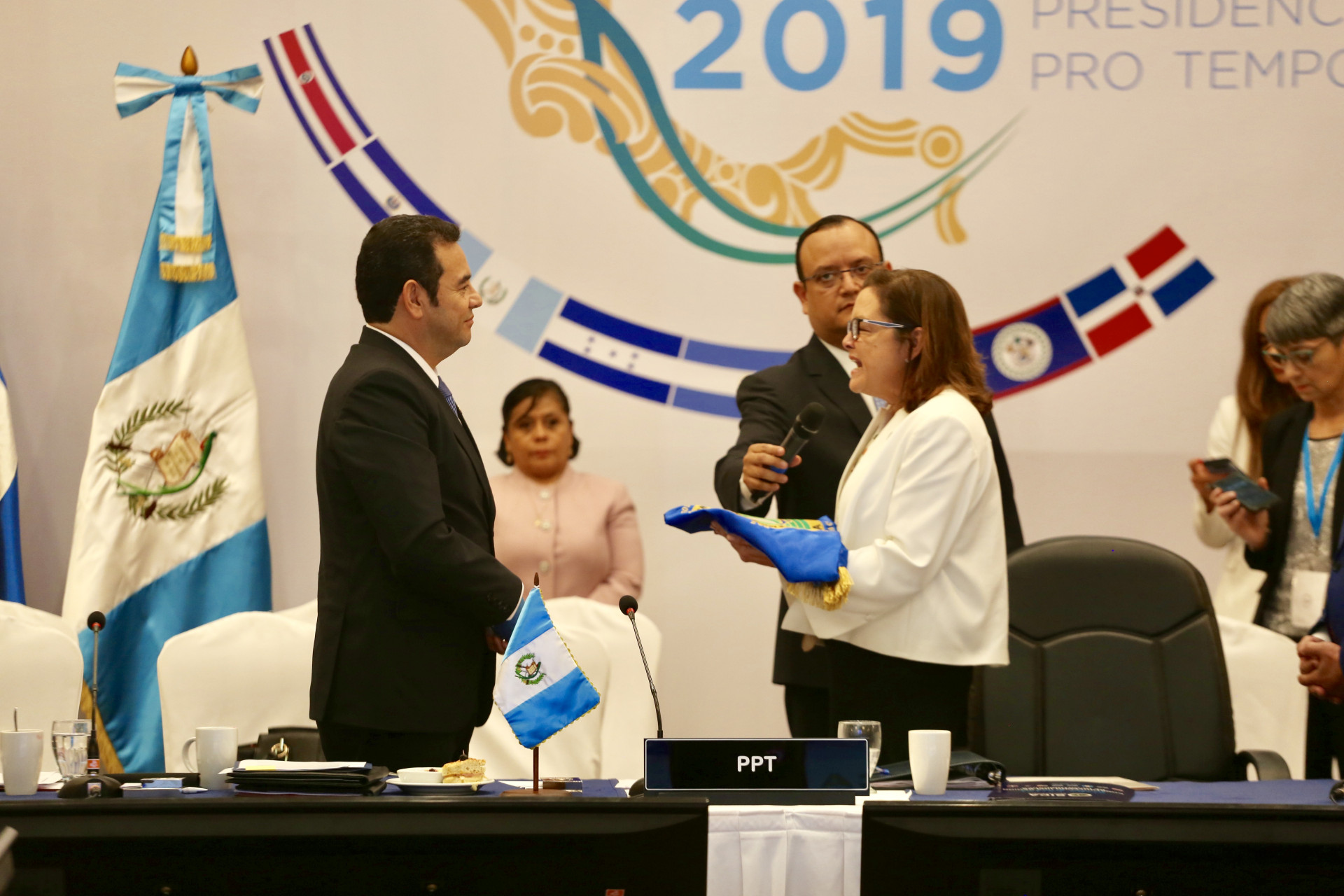 Traspaso de la presidencia pro tempore del SICA a El Salvador, por un período de seis meses, comprendidos del primero de julio al 31 de diciembre del presente año. Entrega la bandera el presidente de Guatemala, Jimmy Morales, y recibe, Alexandra Hill Tinoco, canciller de El Salvador. Foto: Romelio Montero/Presidencia República Dominicana Enlace noticia: presidencia.gob.do/noticias/en-guatemala-danilo-medina-ll... Video YouTube: www.youtube.com/watch?v=FZ5mnbxKI7Q
