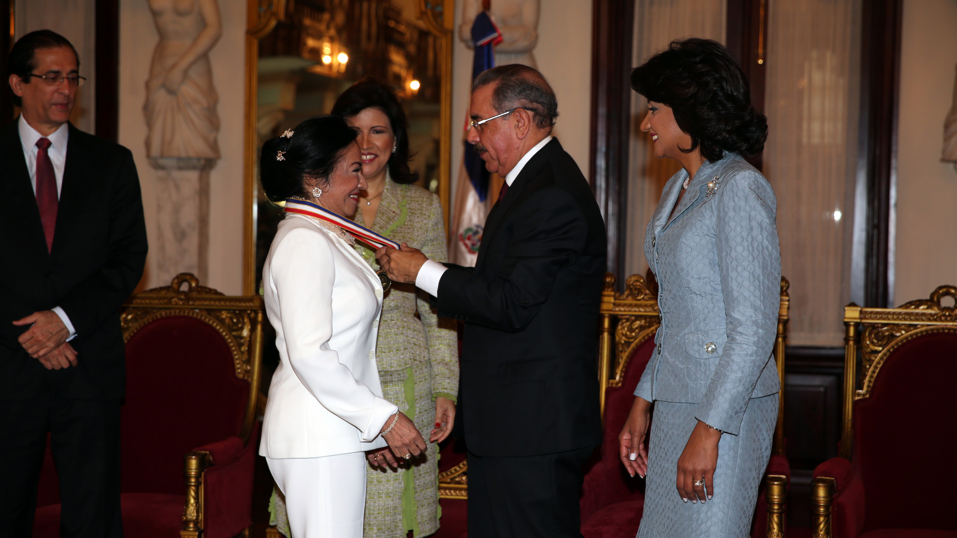El presidente Danilo Medina impuso la Medalla al Mérito de la Mujer 2014, en Ciencia y Tecnología, a Argelia Ramona Aybar Muñoz, con motivo del Día Internacional de la Mujer, en un acto efectuado en el salón Las Cariátides del Palacio Nacional.