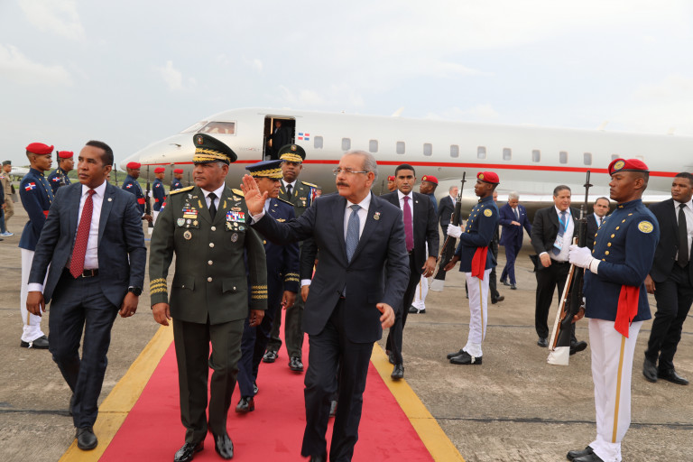 El presidente Danilo Medina regresó al país, a las 5:53 de la tarde, por la Base Aérea de San Isidro, procedente de Guatemala, luego de concluir su participación en la LIII Reunión de Jefes de Estado y de Gobierno del Sistema de Integración Centroamericana (SICA).