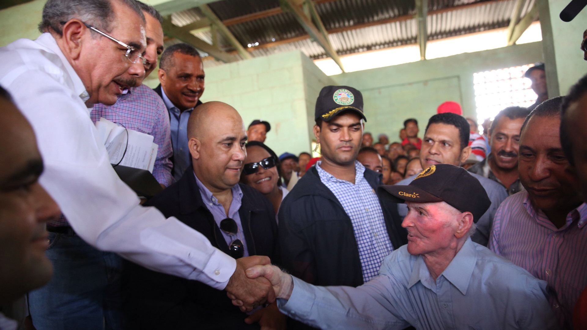 Presidente Medina cuando recibe saludos de comunitarios presentes durante su visita sorpresa para reunirse con productores de la zona.