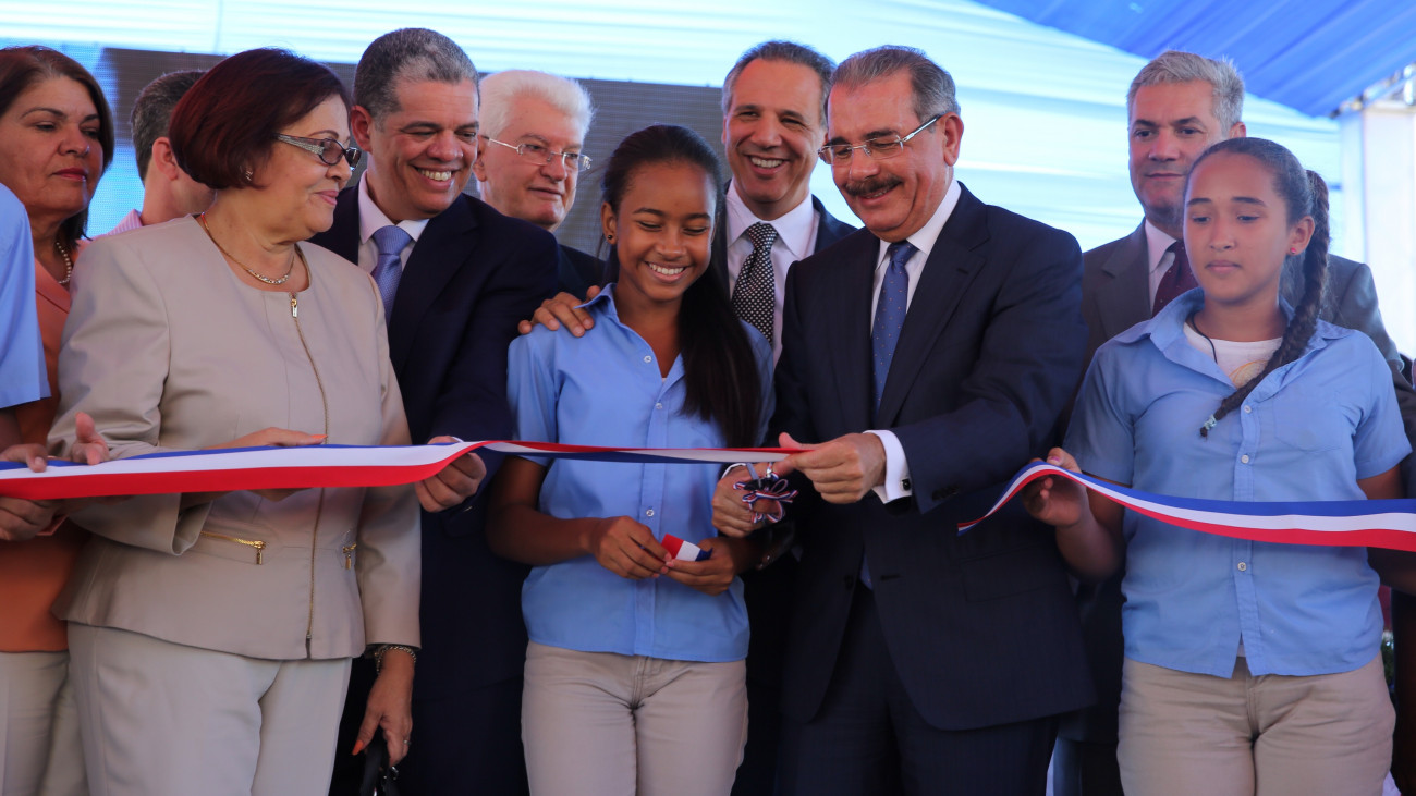 El presidente Danilo Medina, corta la cinta para dejar formalmente inauguradas hoy nueve escuelas básicas en la provincia Peravia. Acompañan al Mandatario, Carlos Amarante Baret, ministro de Educación, Wilton Guerrero, senador Peravia, ministro José Ramón Peralta, ministro Gonzalo Castillo, dos estudiantes del centro inaugurado y Nelly Melo de Guerrero, gobernadora provincial de Peravia, entre otros.