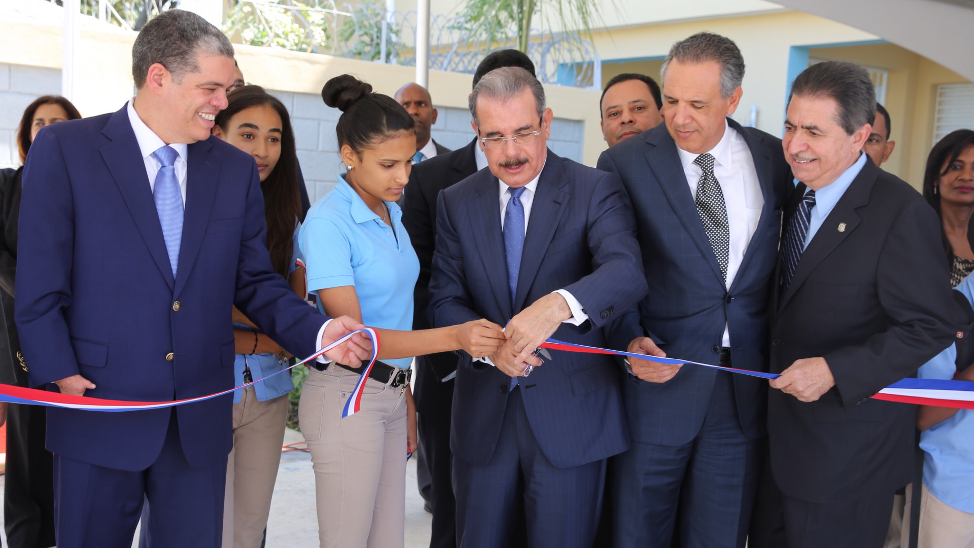 Presidente Danilo Medina corta la cinta para dejar formalmente inauguradas hoy nueve escuelas básicas en la provincia Peravia. Acompañan al Mandatario, Carlos Amarante Baret, ministro de Educación, el ministro José Ramón Peralta, estudiantes y directores del centro escolar presentes en la actividad.