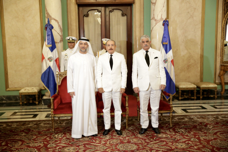 El presidente de la República, Danilo Medina al recibir a Bader Almatrooshi, embajador extraordinario y plenipotenciario de los Emiratos Árabes Unidos en el país.