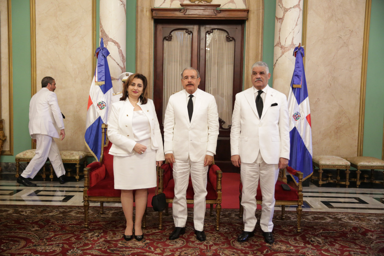 El presidente de la República, Danilo Medina, el canciller Miguel Vargas, y Sra. Sima Sami Balhous, embajadora extraordinaria y plenipotenciaria del Reino Hachemita de Jordania en el país.