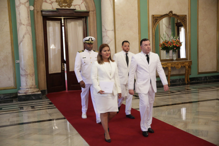 Sra. Iris Audelly Acuña Huete, embajadora extraordinaria y plenipotenciaria de la República de Nicaragua en el país, a su llegada al Salón de Embajadores del Palacio Nacional.