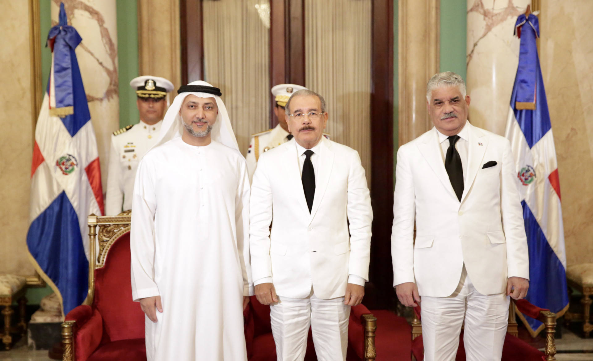 El presidente de la República, Danilo Medina junto al canciller Miguel Vargas, y Bader Almatrooshi, embajador extraordinario y plenipotenciario de los Emiratos Árabes Unidos en el país.