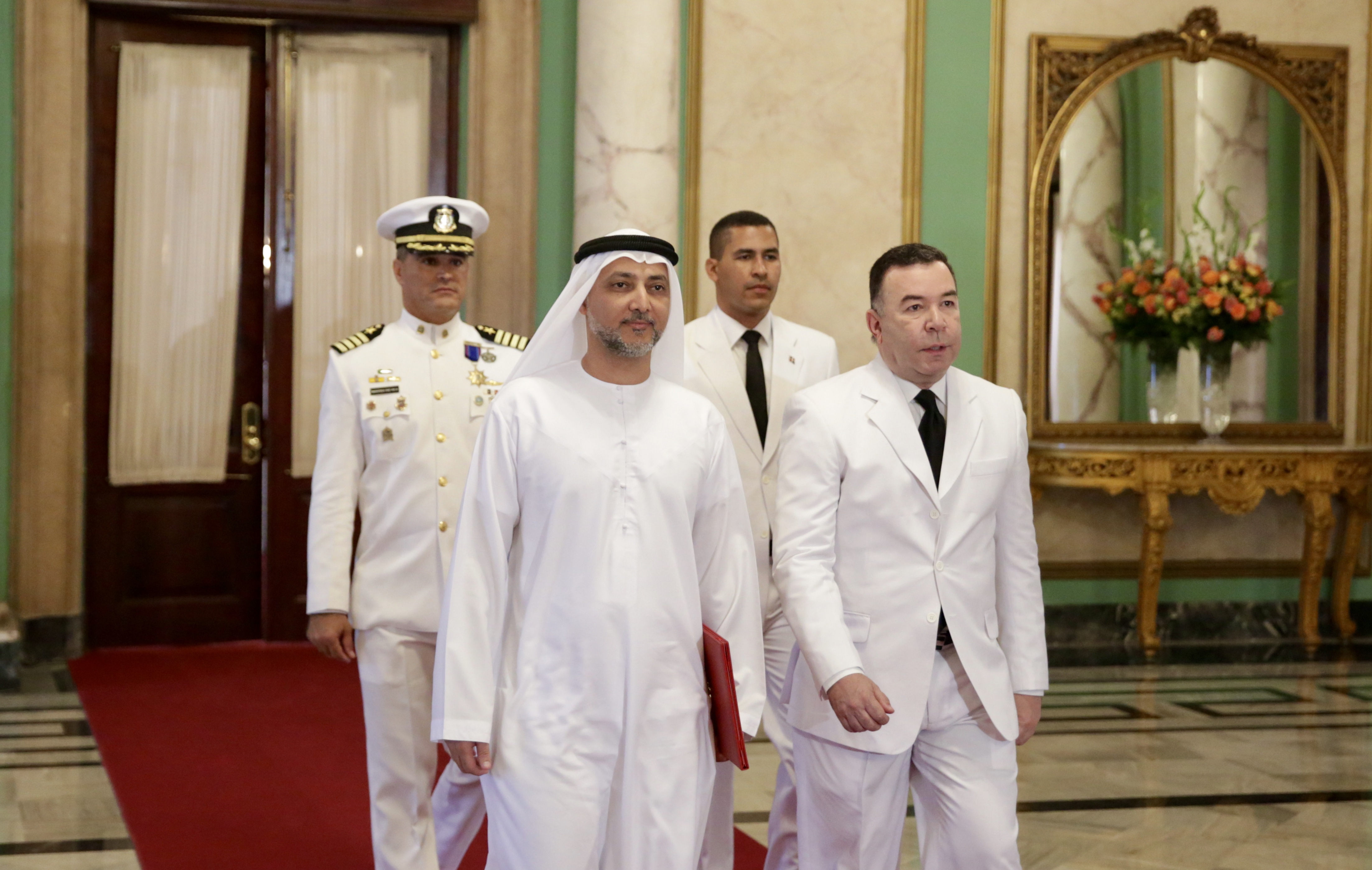 Bader Almatrooshi, embajador extraordinario y plenipotenciario de los Emiratos Árabes Unidos en el país. durante su llegada al Salón de Embajadores del Palacio Nacional.