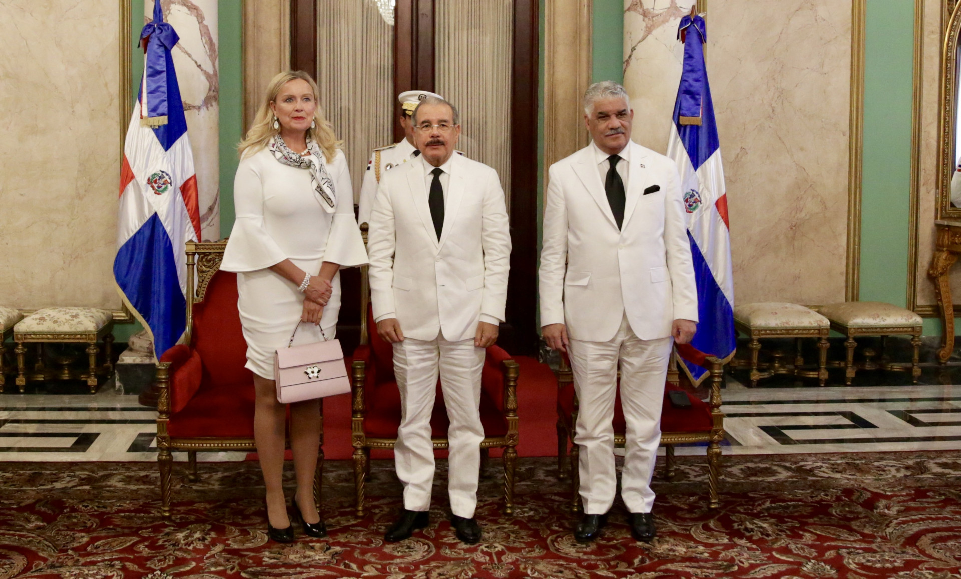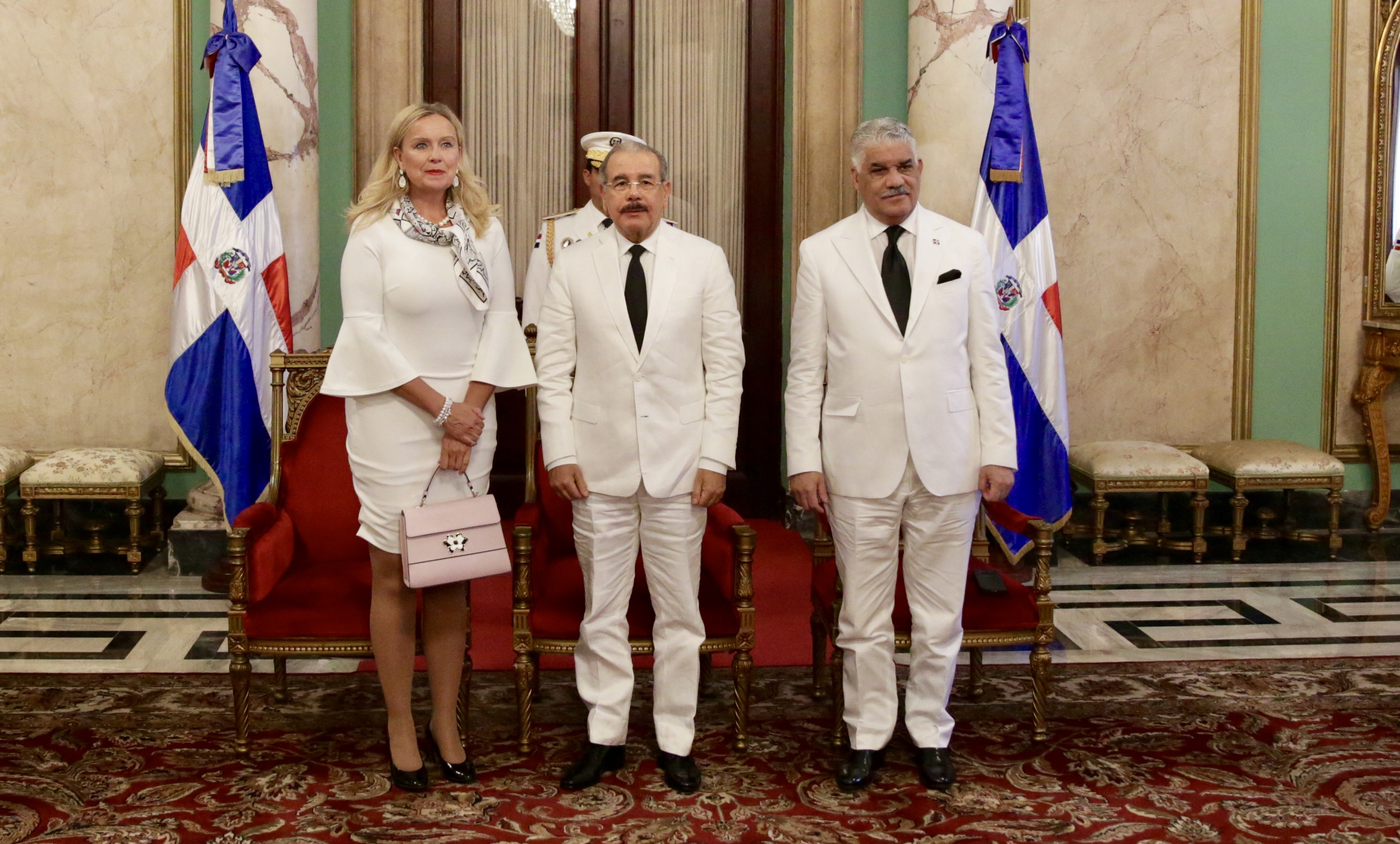 Sra. Elisabeth Eklund, embajadora extraordinaria y plenipotenciaria del Reino de Suecia en el país; el presidente de la República, Danilo Medina, y el ministro de Relaciones Exteriores, Miguel Vargas.