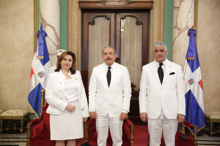 El presidente de la República, Danilo Medina, el canciller Miguel Vargas, y Sra. Sima Sami Balhous, embajadora extraordinaria y plenipotenciaria del Reino Hachemita de Jordania en el país.