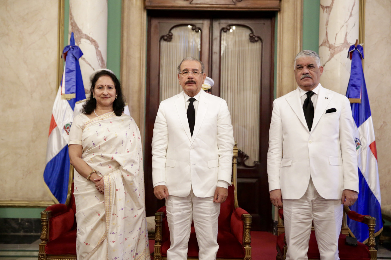 El presidente de la República, Danilo Medina; el canciller Miguel Vargas, y la Sra. Madhu Sethi, embajadora extraordinaria y plenipotenciaria de la República de la India en el país.