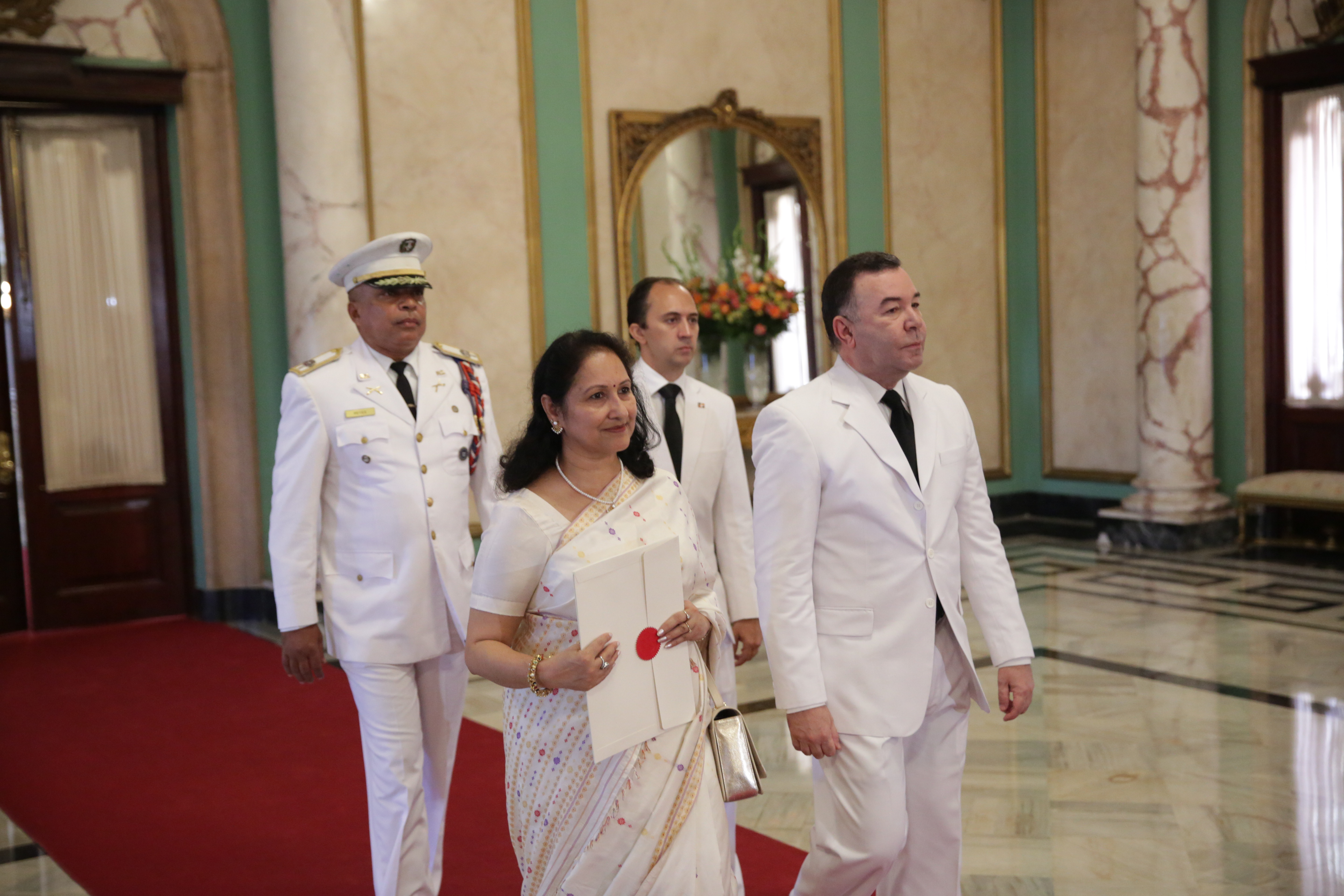 El presidente de la República, Danilo Medina; el canciller Miguel Vargas, y la Sra. Madhu Sethi, embajadora extraordinaria y plenipotenciaria de la República de la India en el país.