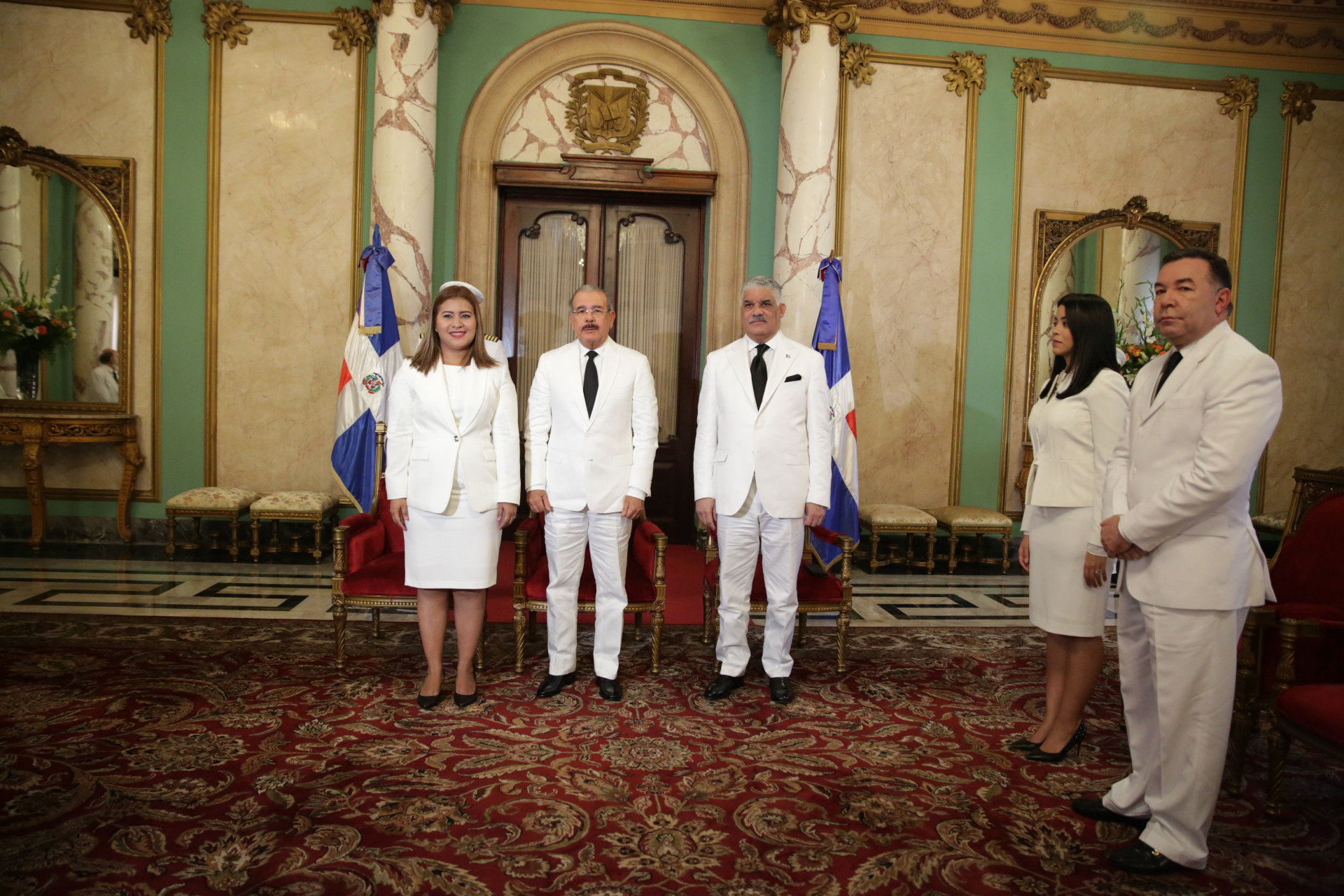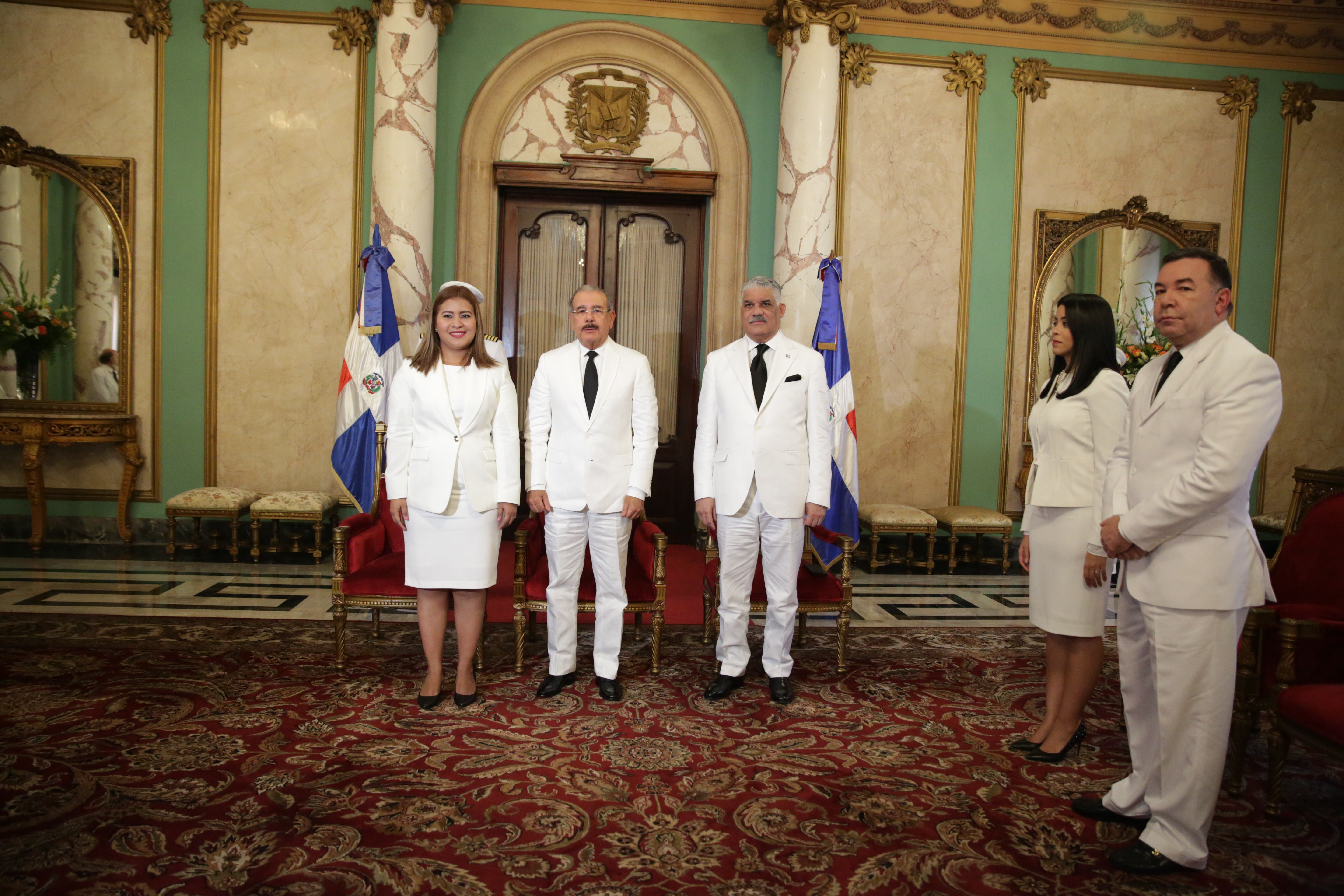 El presidente de la República, Danilo Medina, el canciller Miguel Vargas, y la Sra. Iris Audelly Acuña Huete, embajadora extraordinaria y plenipotenciaria de la República de Nicaragua en el país.