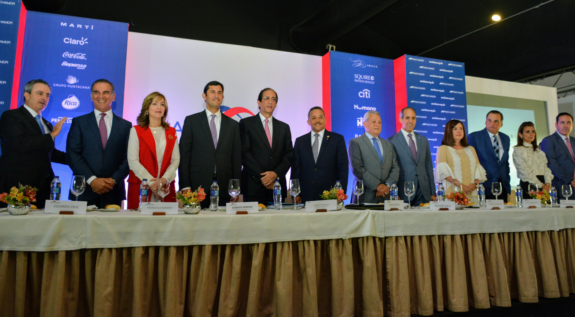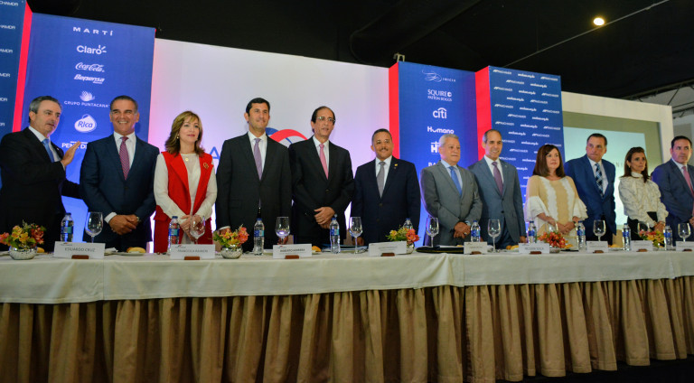 El ministro de la Presidencia, Gustavo Montalvo junto a los directivos de la Cámara Americana de Comercio y participantes en el evento.