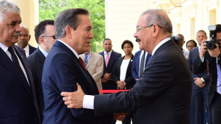 El presidente Danilo Medina y presidente electo de Panamá, Laurentino Cortizo, a su llegada al Palacio Nacional, acompañado del ministro de Relaciones Exteriores, Miguel Vargas Maldonado y sus respectivas delegaciones.