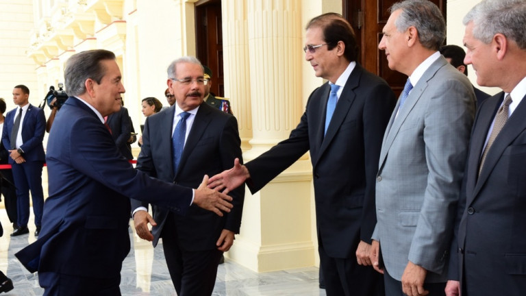 El presidente electo de Panamá, Laurentino Cortizo saluda delegación oficial dominicana, integrada por Gustavo Montalvo, ministro de la Presidencia; José Ramón Peralta, ministro Administrativo de la Presidencia; Gonzalo Castillo, ministro de Obras Públicas y Comunicaciones; Flavio Darío Espinal, consultor jurídico del Poder Ejecutivo, y Carlos Pared Pérez, asistente especial del presidente de la República.