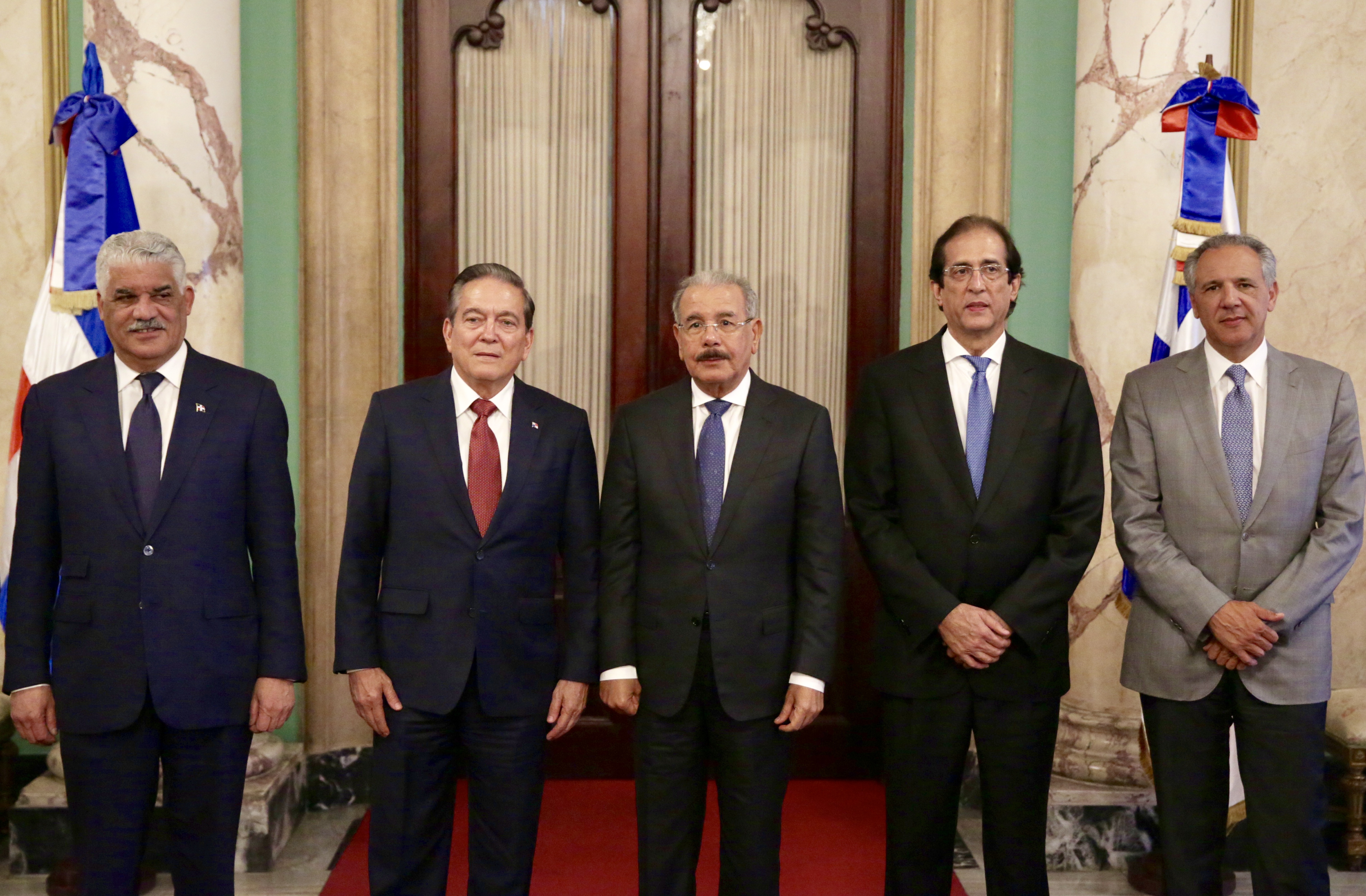 El ministro de Relaciones Exteriores, Miguel Vargas; presidente electo de Panamá, Laurentino Cortizo; presidente Danilo Medina; ministro de la Presidencia, Gustavo Montalvo, y ministro Administrativo de la Presidencia José Ramón Peralta.