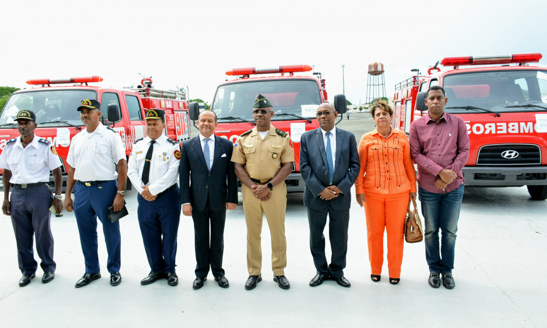 El director del Sistema Nacional a emergencia 911 Vicente Mota Medina Entrego 3 Camione de Bombero a igual numero de municipio