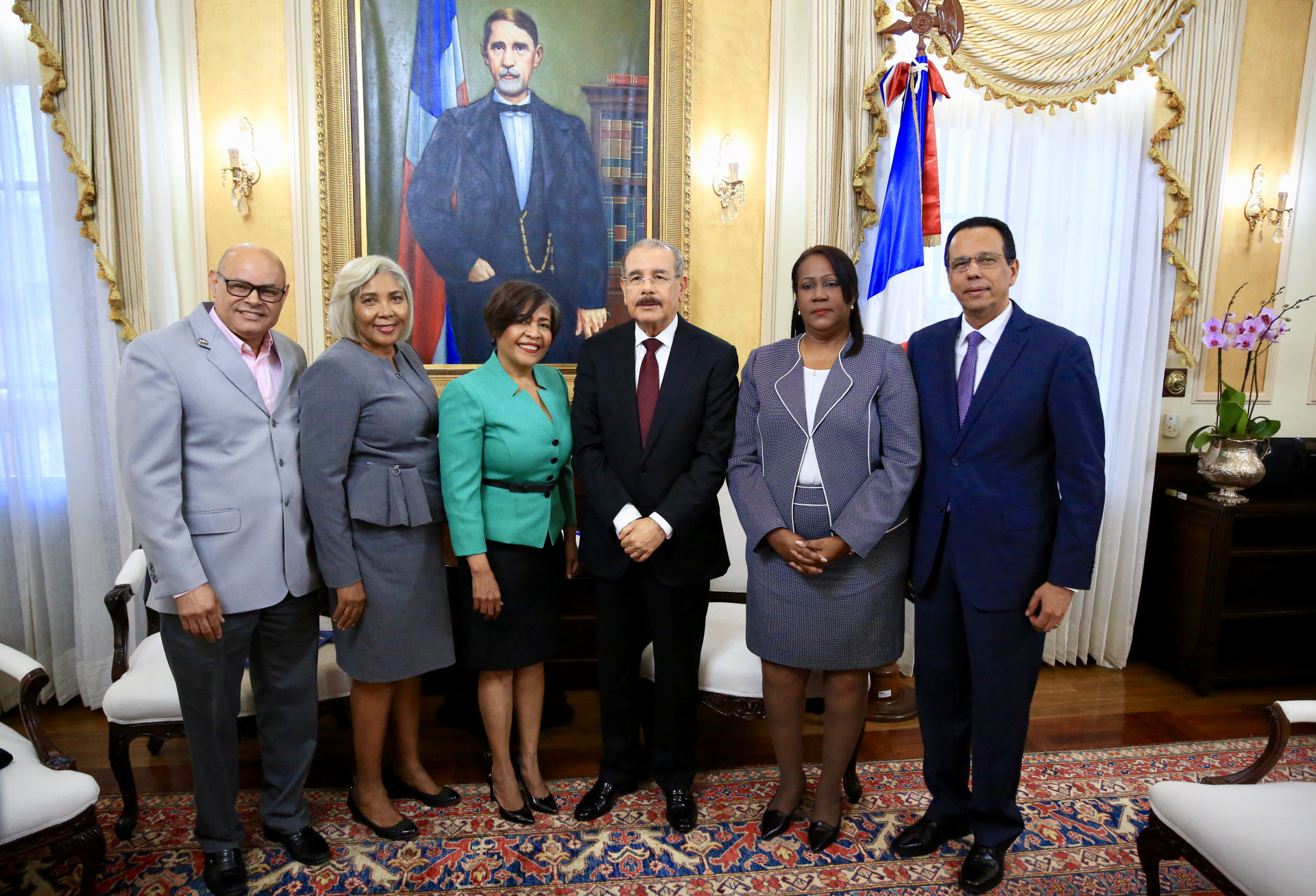 El presidente Danilo Medina con la presidenta de la Asociación Dominicana de Profesores (ADP), Xiomara Guante; el ministro de Educación, Antonio Peña Mirabal y comitiva de acompañantes, presentes en su visita de cortesía en el Palacio Nacional.