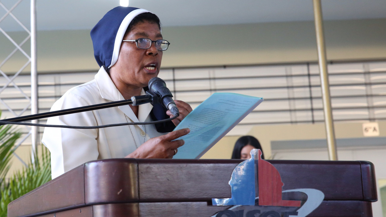 Sor María Altagracia Cordero, directora de la Escuela La Hora de Dios, agradece al presiente Medina por el apoyo brindado y promesa cumplida