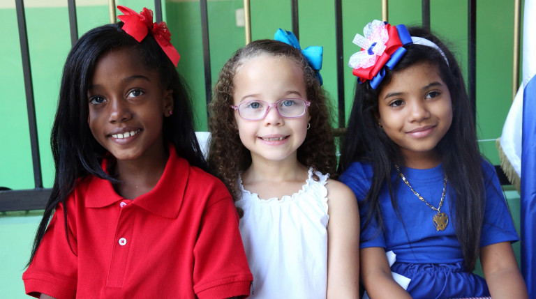 Tres niñas de la comunidad entregan un documento con los nombres de todos los estudiantes de la Escuela La Hora de Dios, de Herrera y agradecen al Presidente Medina la ampliación de su centro de enseñanza.
