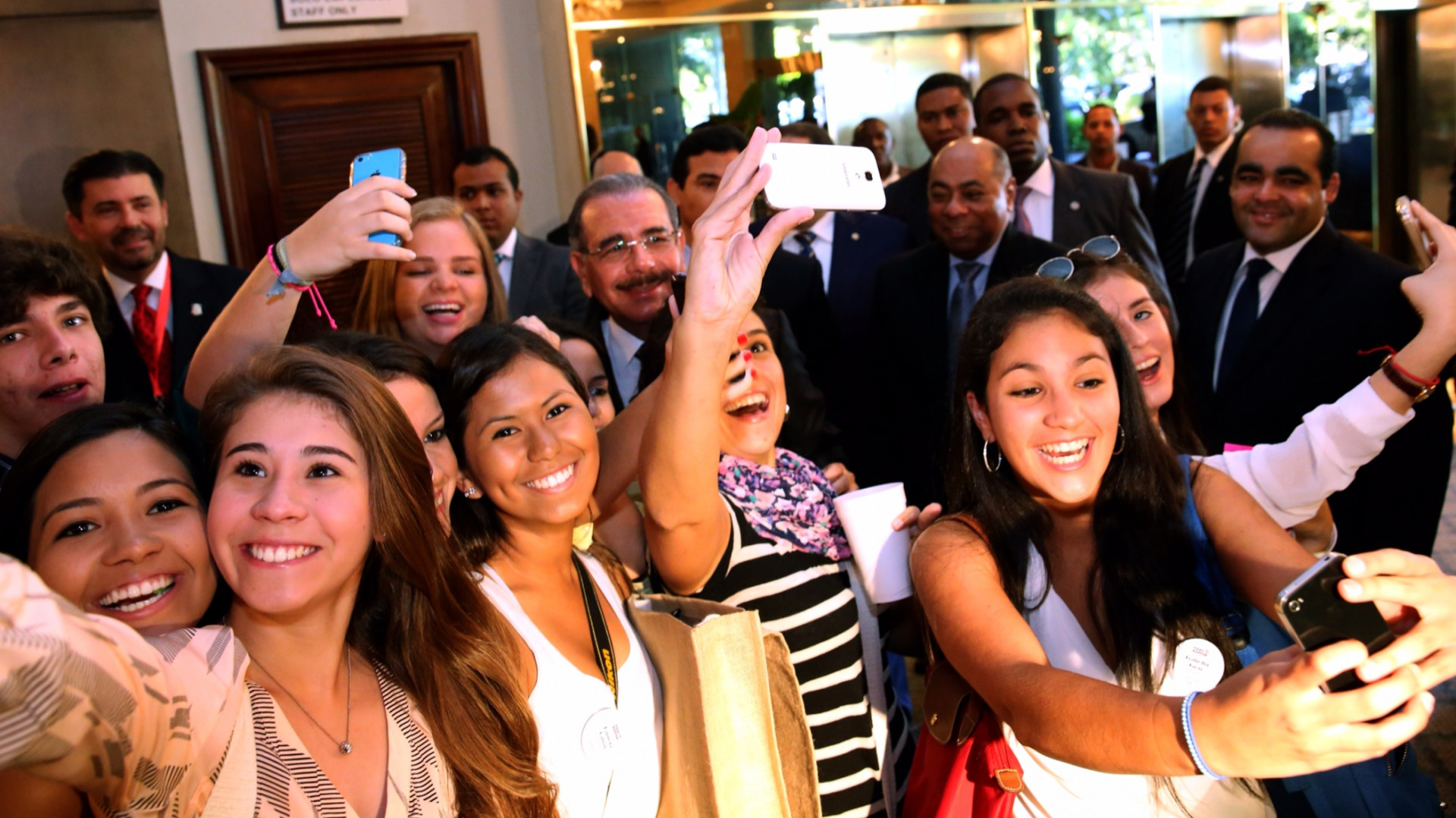 El presidente de la República, Danilo Medina y jóvenes que estaban presentes cuando el mandatario llegó a la recepción inaugural de la X Conferencia Iberoamericana de Justicia Constitucional, efectuada en el Hotel Occidental El Embajador, de esta ciudad.
