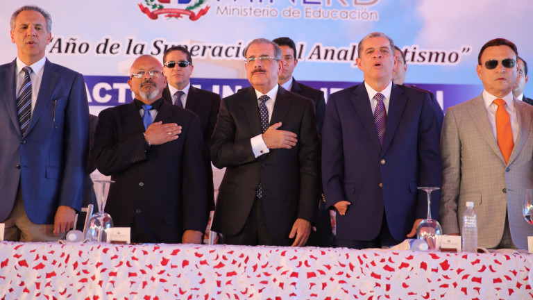 Presidente Danilo Medina al encabezar en un acto conjunto la inauguración de la Escuela Básica Villa San Carlos y la Escuela Básica de Cumayasa, en la provincia La Romana, que aportan al sistema educativo 25 aulas con Jornada de Tanda Extendida. Acompañan al mandatario, el ministro José Ramón Peralta; el gobernador de La Romana, Juan José Santana; ministro Carlos Amarante Baret; y director general OISOE, Miguel Pimentel Kareh; entre otros.