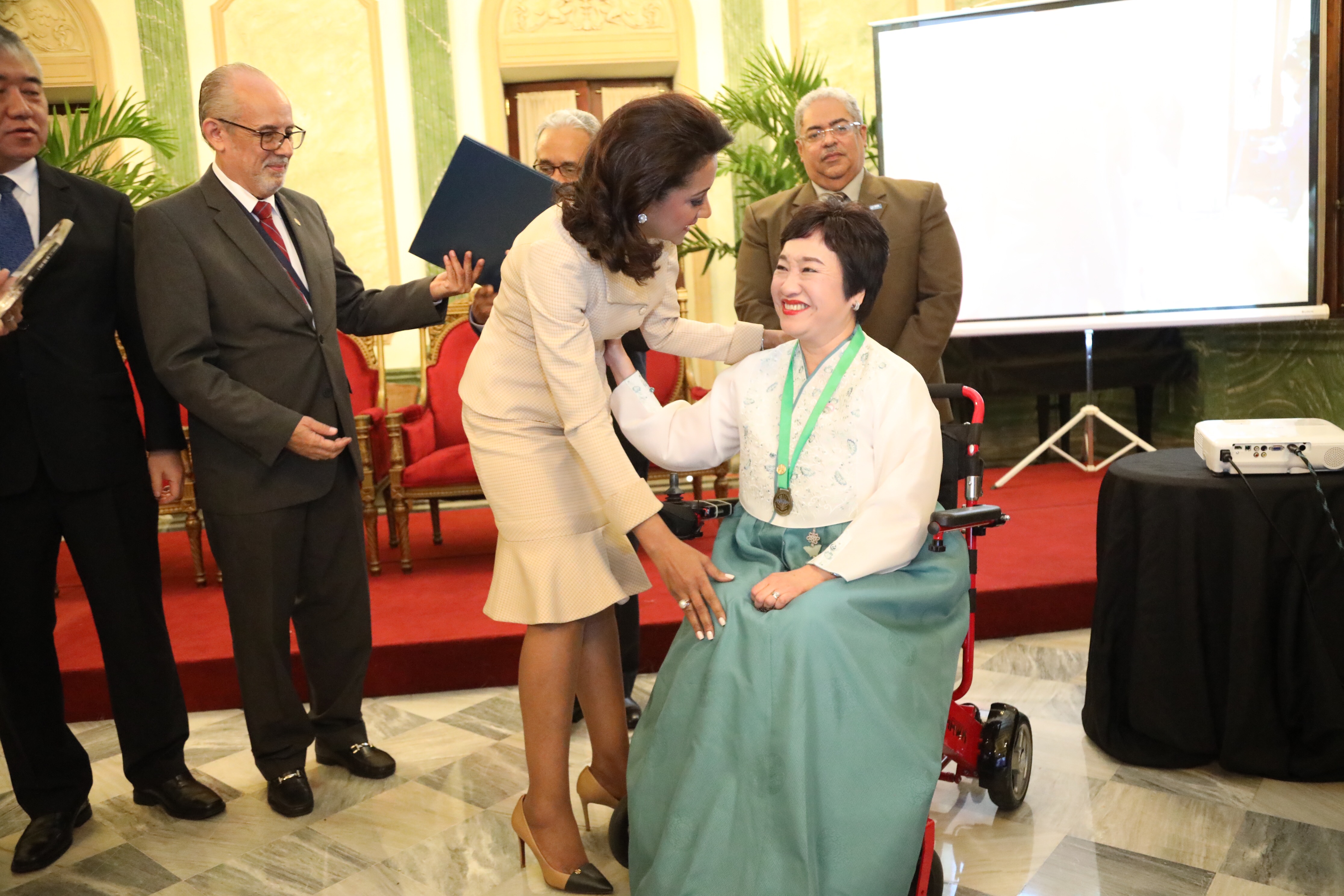 La primera dama de la República, Cándida Montilla de Medina, entregó el premio Pediatra más destacada del año a la doctora Yun Zyong Kim, coreana nacionalizada dominicana.