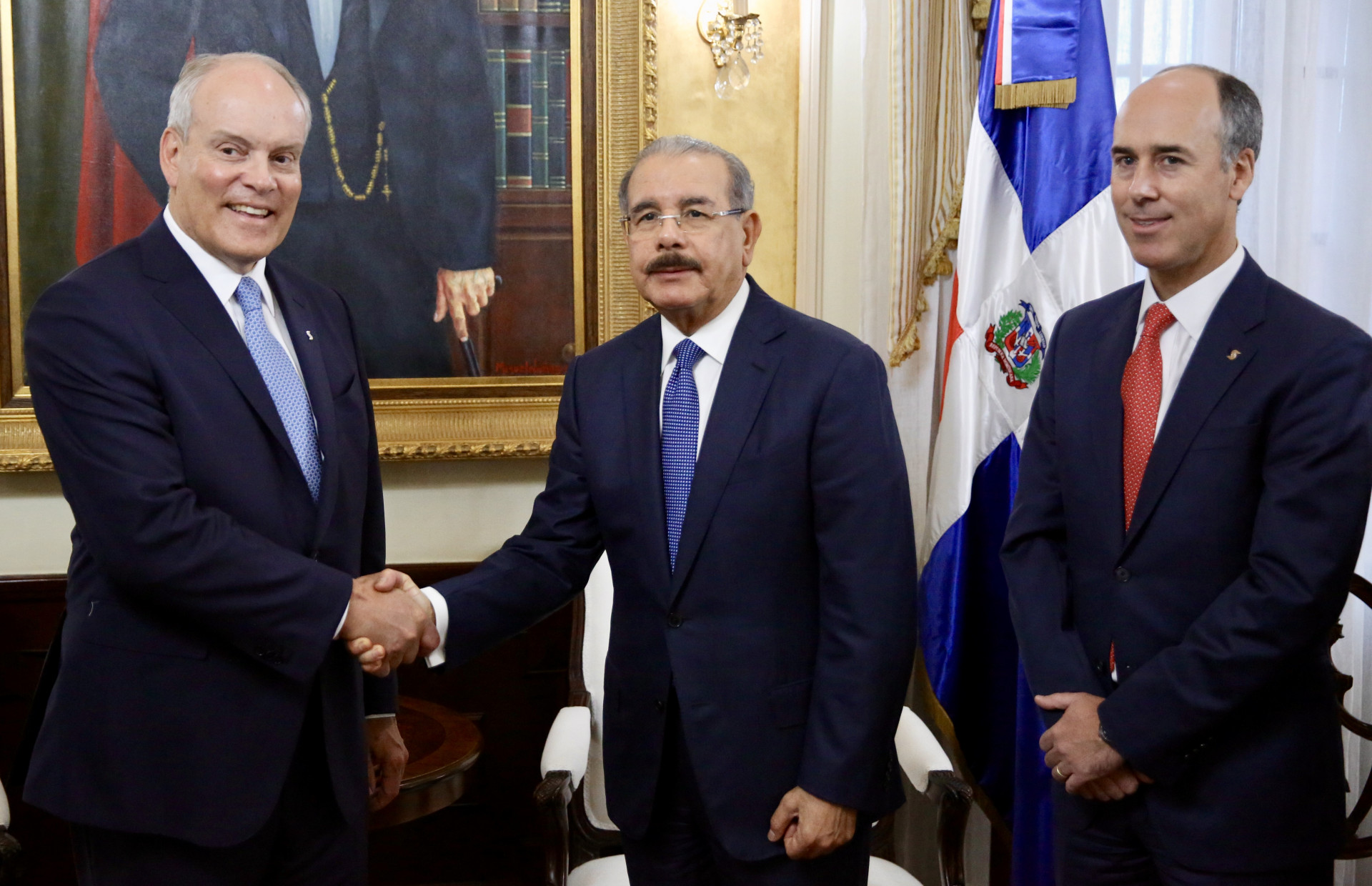 El presidente Danilo Medina con el presidente a nivel mundial del Scotiabank, Brian Porter y Gonzalo Parral, durante el encuentro.