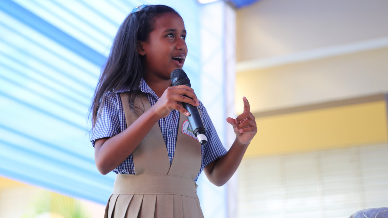 Aris Margarita Cuevas declamando el poema "Dominicana hasta la tambora".