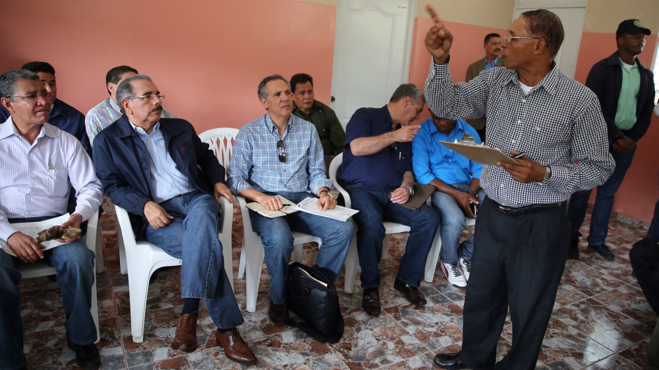 El presidente Danilo Medina al escuchar uno de los dirigentes de la asociación durante encuentro con productores de café de la comunidad.