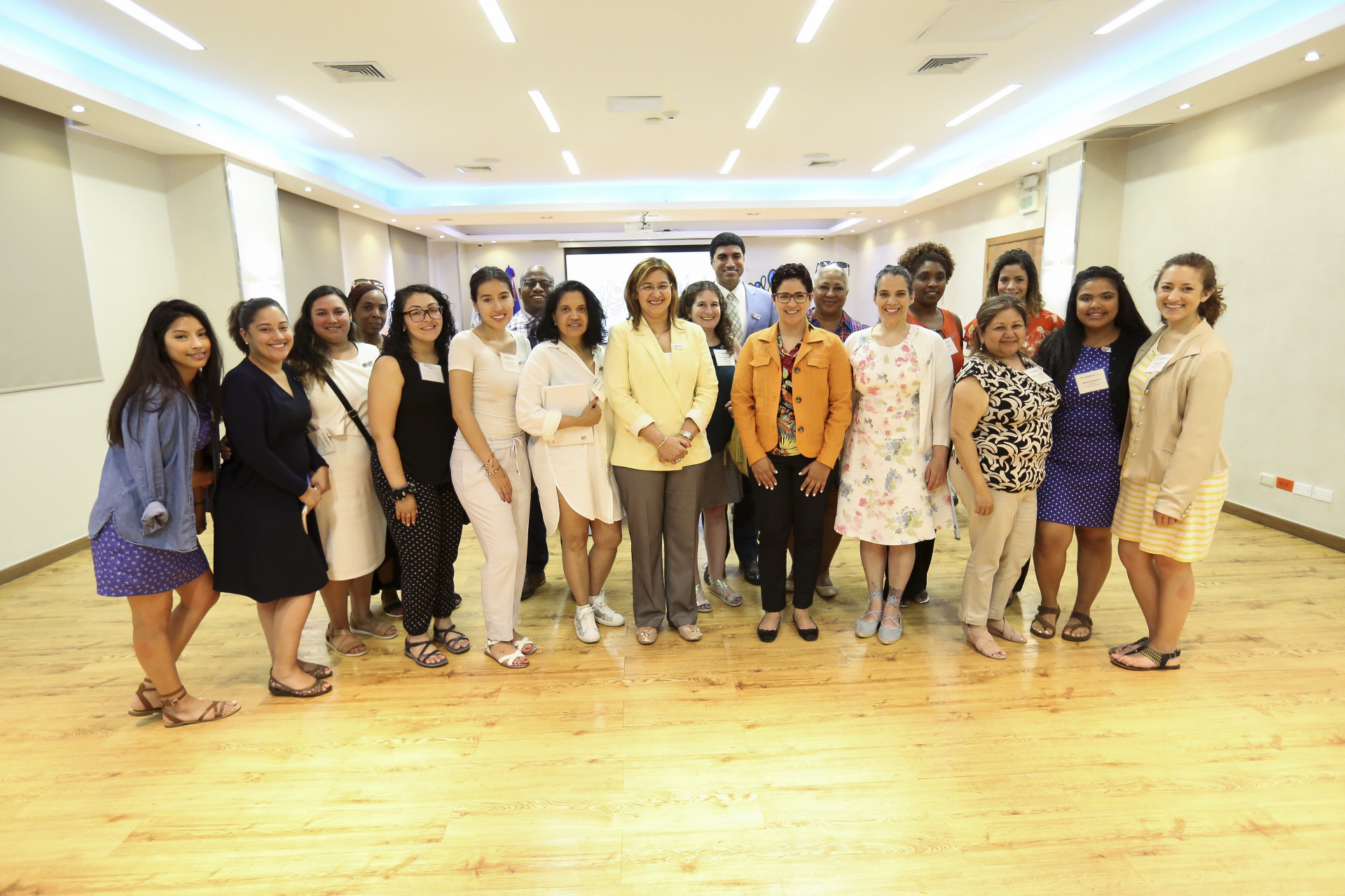 Delegación de docentes del Hostos Community College de New York, junto a la supervisora de Servicios de Salud, Mayra Ramos; la encargada del Servicio de Pediatría, Yahila de Peña; y la encargada del programa de Pasantías del CAID, Natalia Aquino, durante la visita de cortesía a la institución.