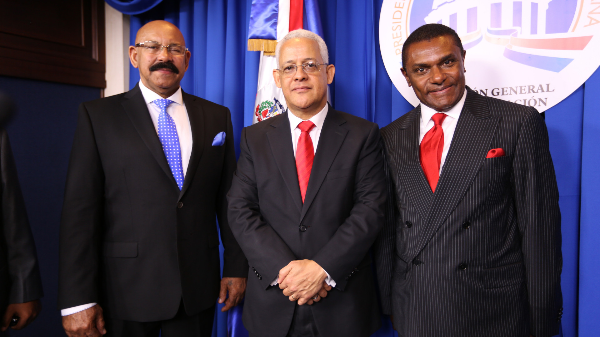 A la izquierda, Oscar D´León, José Antonio Aybar y José Alberto “El Canario”, durante encuentro con la prensa luego de su visita al Mandatario en el Palacio Nacional.