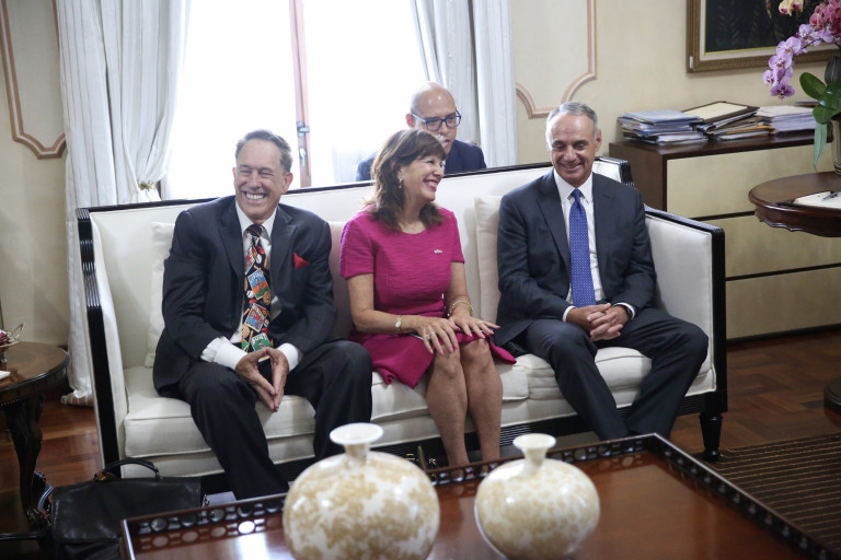 El presidente Danilo Medina garantizó apoyo firme, seguimiento y atención a los niños, jóvenes y adolescentes que aspiran a la carrera del béisbol de Grandes Ligas y, con ello, hacer realidad su sueño e ilusión, sin que abandonen la escuela ni los programas de educación. 8 de agosto de 2019.- Ver más información: Nota de prensa: presidencia.gob.do/noticias/en-visita-del-comisionado-mlb...
