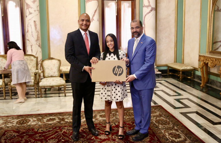 Le acompaña, el presidente del Instituto Dominicano de las Telecomunicaciones (INDOTEL), Nelson José Guillén.